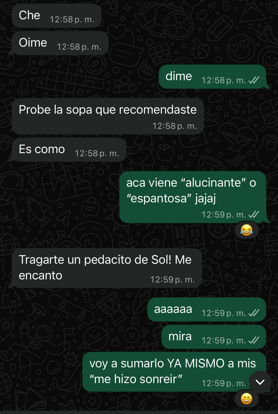 Espero que tengas una semana llena de cosas que te hagan sonreír. No des por sentado lo feliz que te puede poner hacer algo chiquito como unos mates en la plaza, un café con algo rico, unas cervezas con amigos. También es un lindo momento para recordar que eso que nos estresa seguramente no sea tan importante como nuestra cabeza trata de hacernos creer.